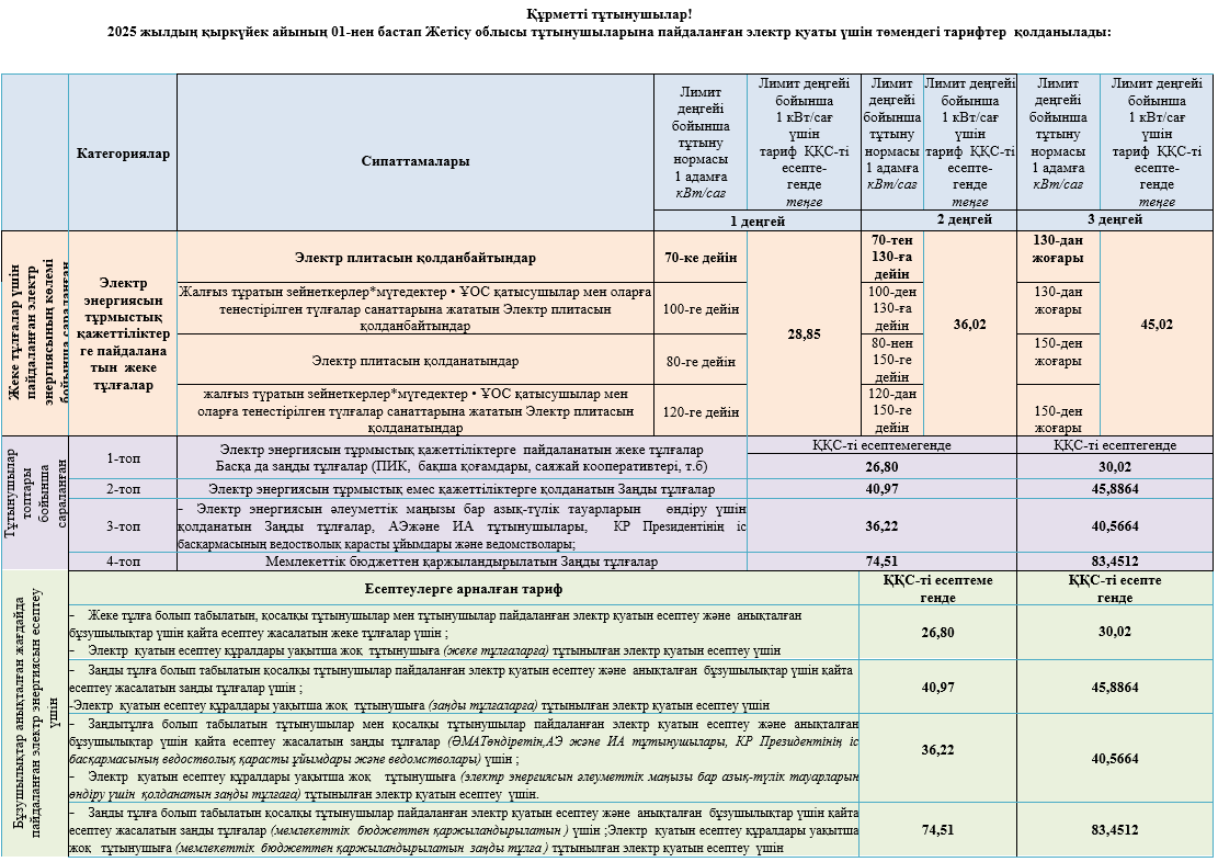 | Электр плиталарын пайдаланатын жеке тұлғаларға | 1 тұрғынға айына 150 кВт/с жоғары | |
