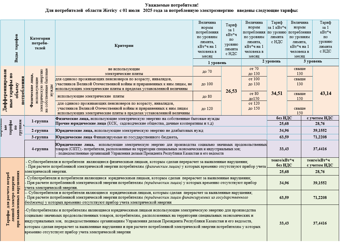 | Категория потребителей Талдыкорганского региона | пределы установленной величины | тариф |